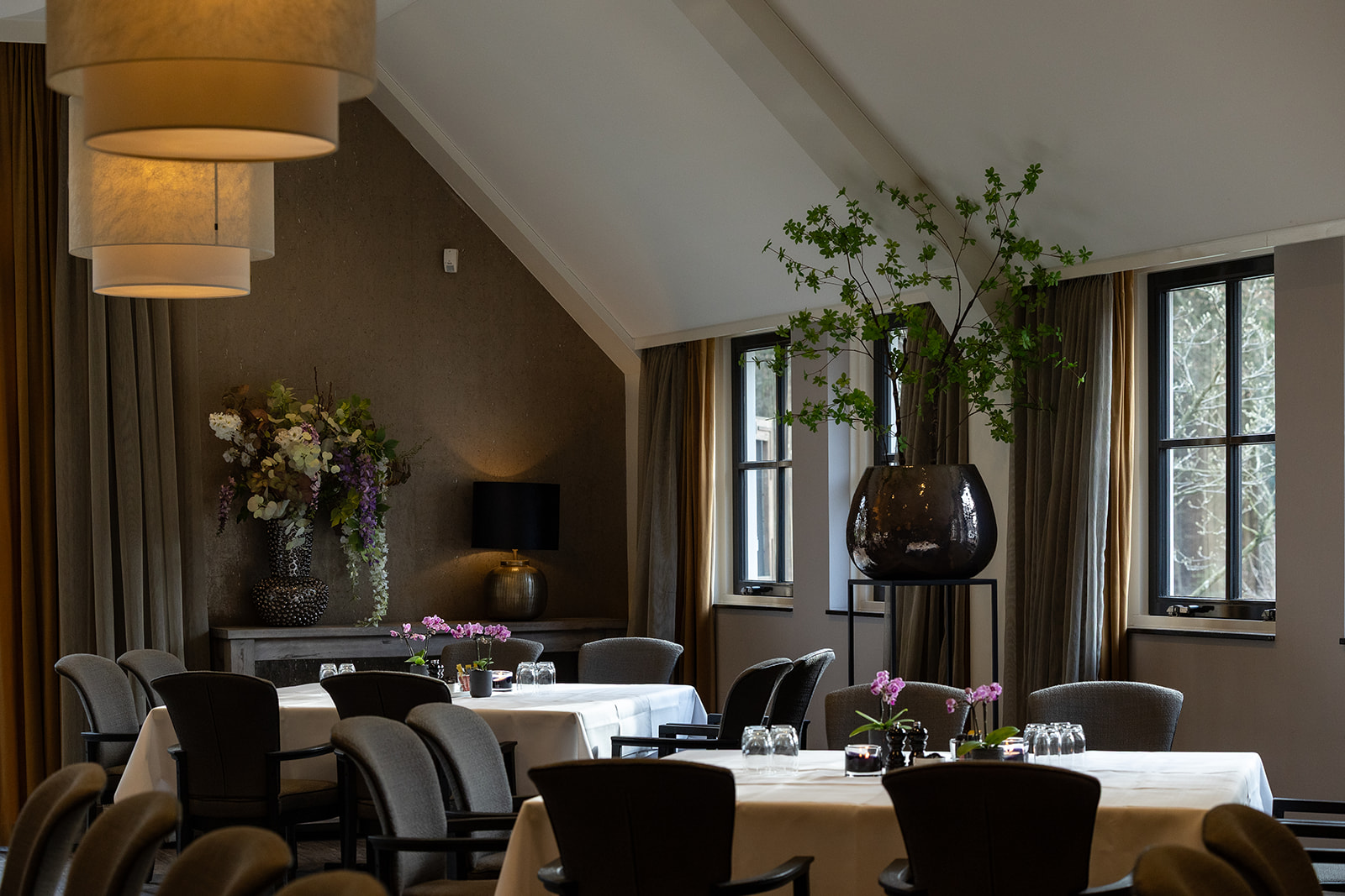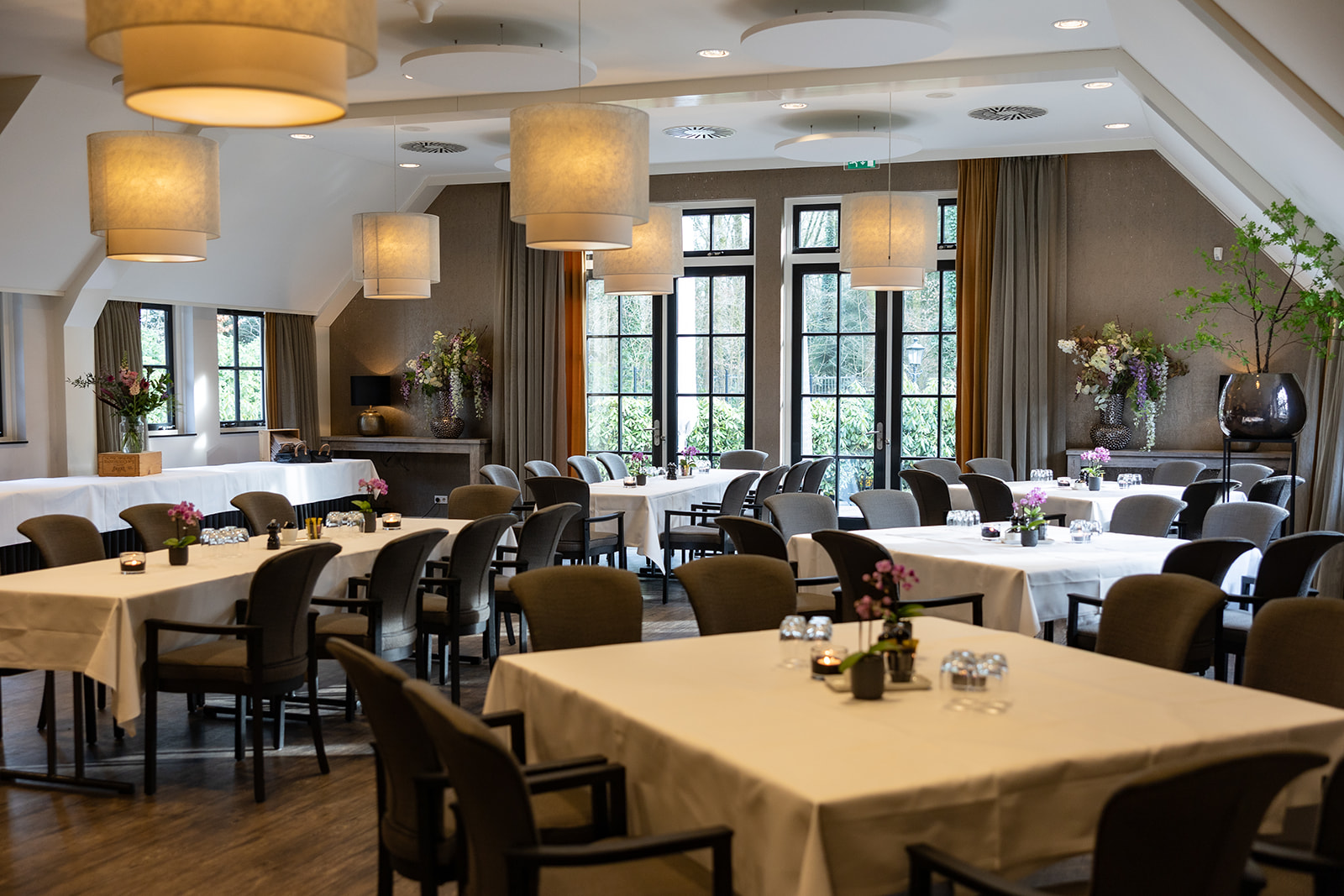 Onze zalen zijn uitgerust met alle benodigde apparatuur en zijn voorzien van airconditioning. In de zomermaanden kunt u gebruikmaken van het aangrenzende terras, met prachtig uitzicht naar de bossen op de Veluwe. De bosrijke omgeving vormt een spectaculair decor voor uw receptie.